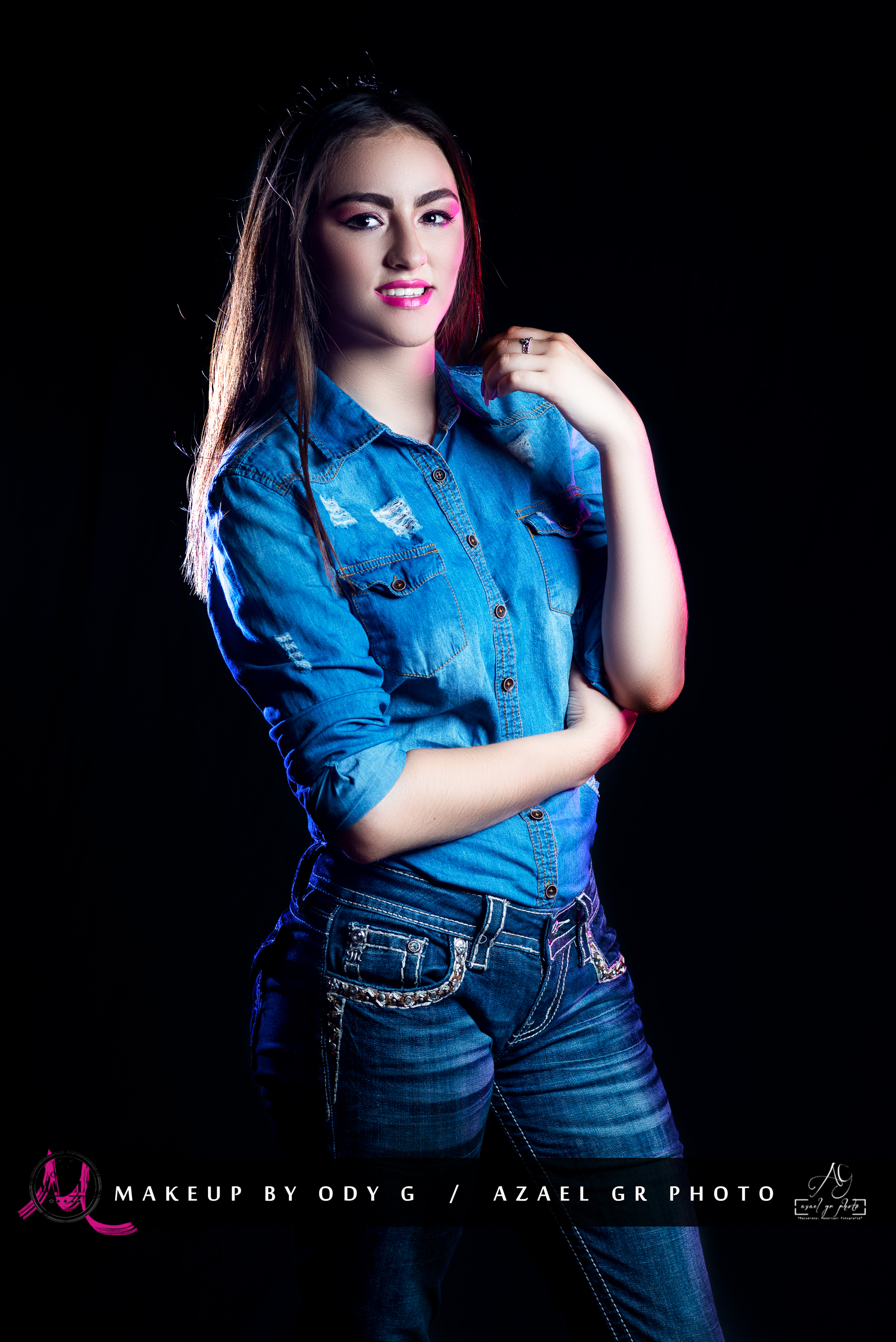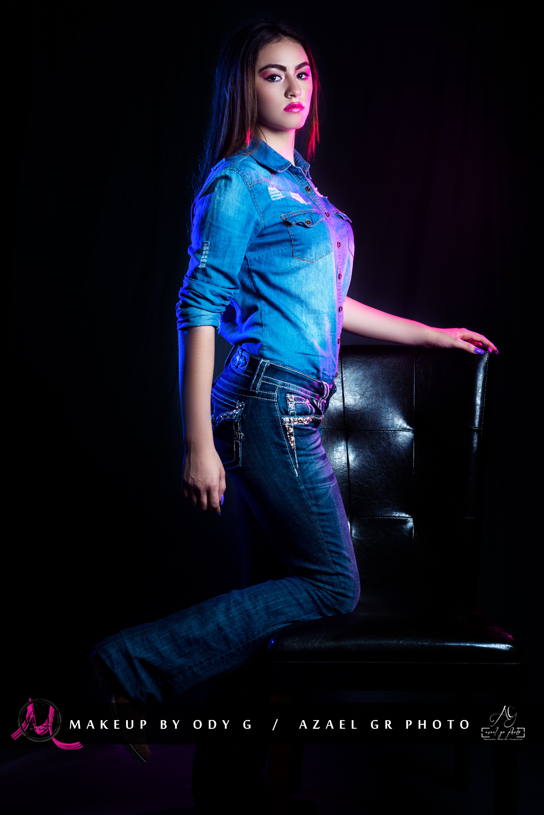 Esta sesión la dividimos en dos partes, la primera parte con encuadres cerrados y una iluminacion muy envolvente, y la segunda parte con retratos de cuerpo completo, en un entorno mas dramático y jugando con luces de colores, para darle un toque mas contrastante aun a la escena.
